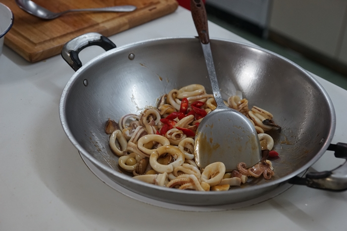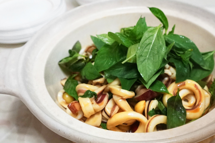 1. 透抽切成圈;白果去殼後再泡熱水去掉內膜,加水後放入電鍋中蒸10分鐘;紅辣椒切斜段;九層塔摘好。。