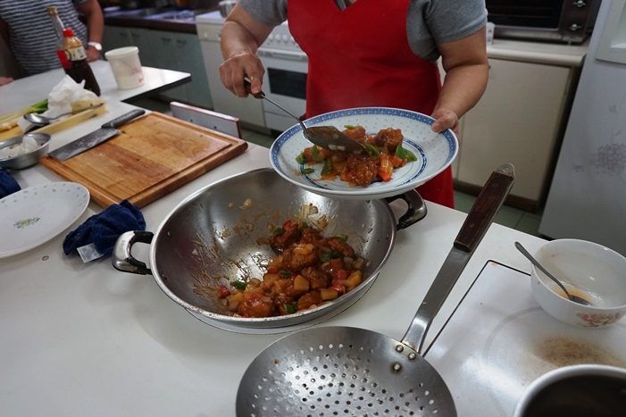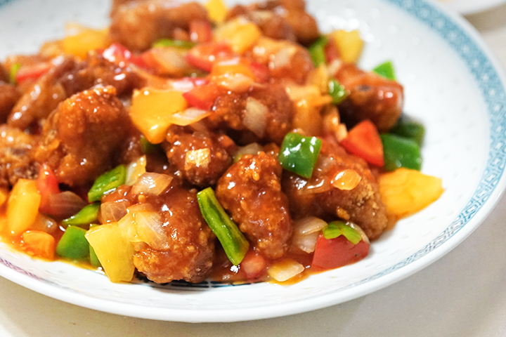 3. 另用2大匙油炒切塊的洋蔥、青椒和番茄,倒下調好的調味料(2),煮滾後加入鳳梨塊和排骨,快速一拌即裝盤上桌。