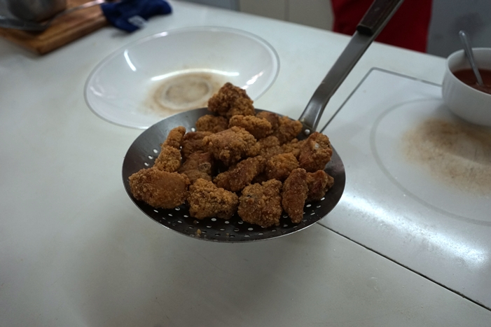 2. 肉塊醃好後沾上地瓜粉,投入熱油中大火炸熟。