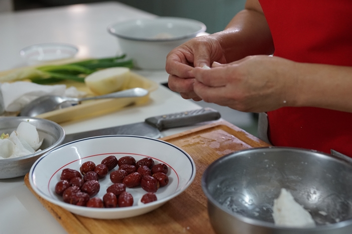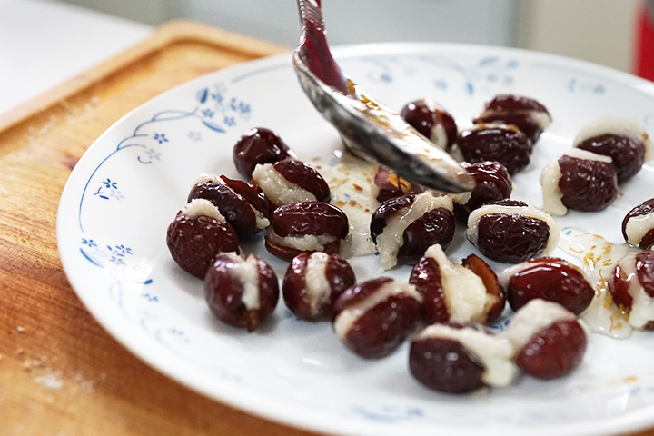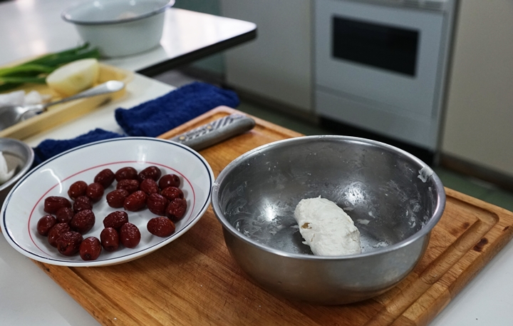 1.紅棗用熱水泡至漲開,約2小時,切一刀口,取出紅棗核。