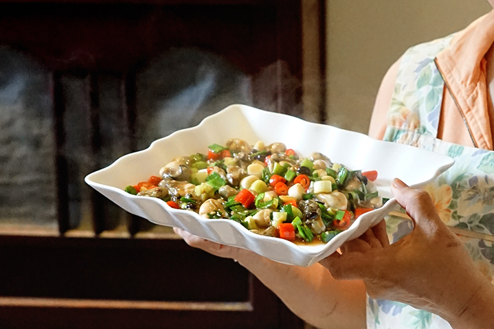 2. 燒熱3大匙油,先爆香蔭豉與大蒜屑,再加入蚵後馬上淋下酒、醬油、糖、胡椒粉及麻油(可預先在一個小碗內調和)。